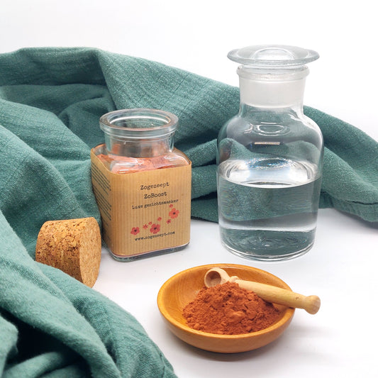 De klei zelf is droog en moet gecombineerd worden met een nat ingrediënt naar keuze. Dat kan water zijn, of je kunt los gaan met nog luxueuzere toevoegingen.